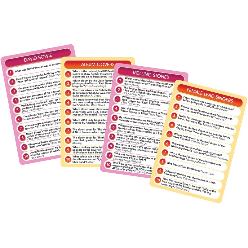 - Subjects include TV, film, music, sport, people, geography, history, art, literature, food, drink, science, nature & general knowledge