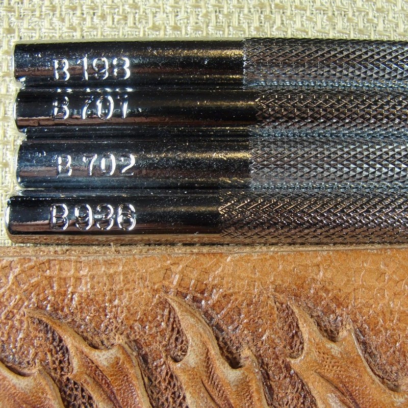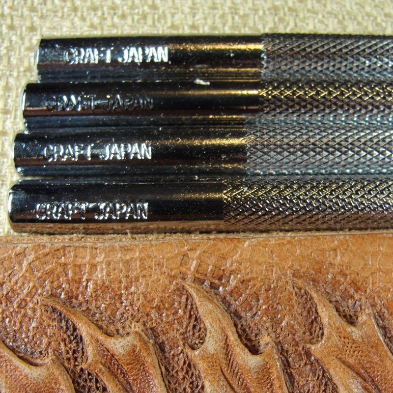 This tools in this Checkered Beveler Stamp set are numbers B198, B701, B702 & B936. The tools measure from 3/32" to 7/32" in width. Stamped on each tool is its number and "Craft Japan". This is a great stamp set that produces nice impressions. The growth and popularity of leather carving in the USA in the 1950's and 60's spread to other countries. While Craftool stamps were the standard, they were not commonly available to craftsmen in foreign countries. In Japan, a couple of companies started producing tools similar to Craftool but also became great innovators. Those companies, Craft and Co. and Kyoshin Elle, produce fine quality tools in unique designs along with the basics.