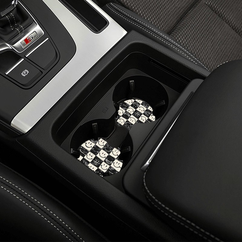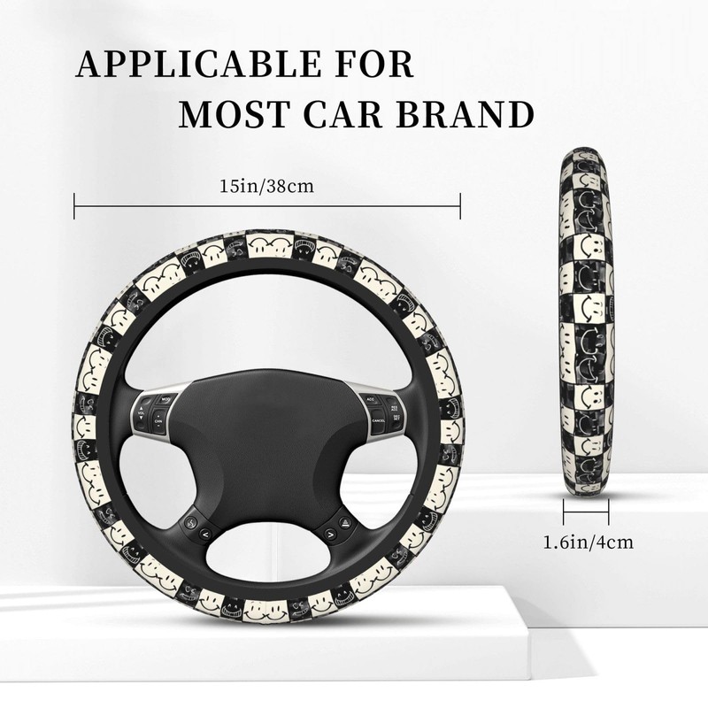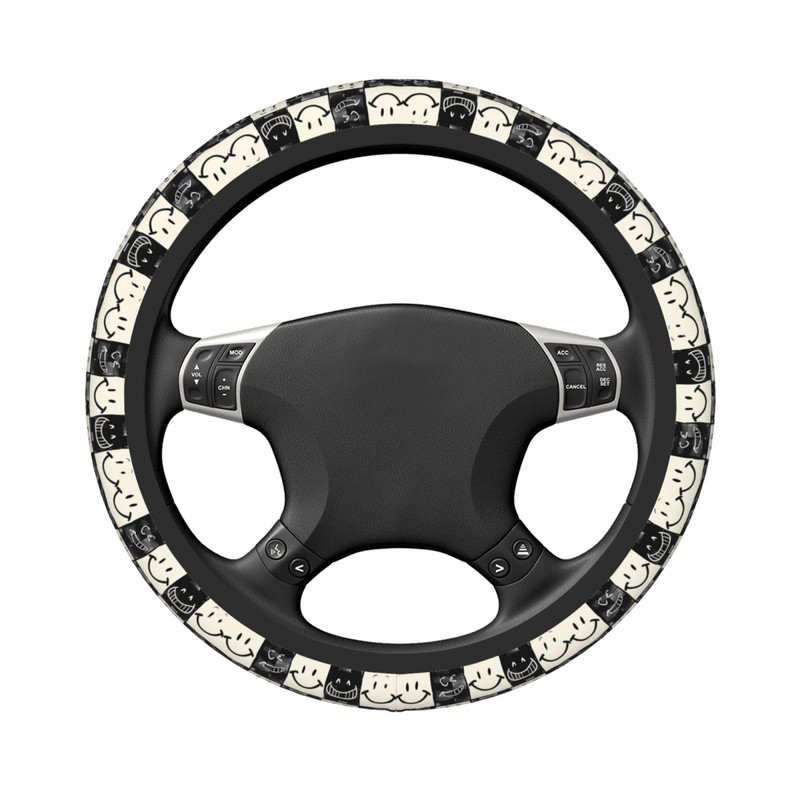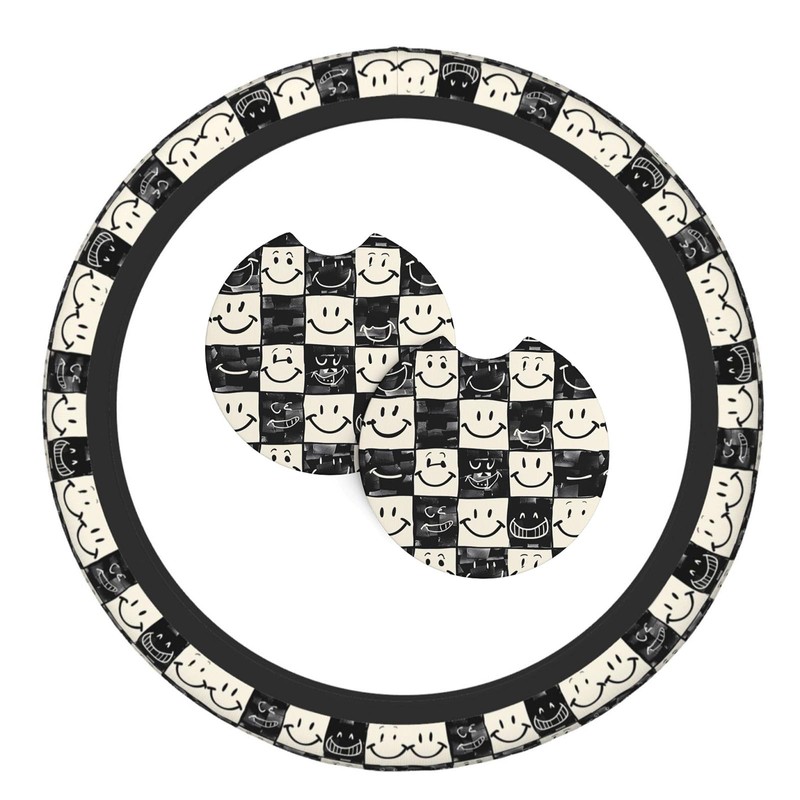 Checkered Pattern with Smiley Faces Steering Wheel Cover with 2 Car Coasters Non Slip Neoprene for Women Men Universal 15 Inch Stylish and Practical Set