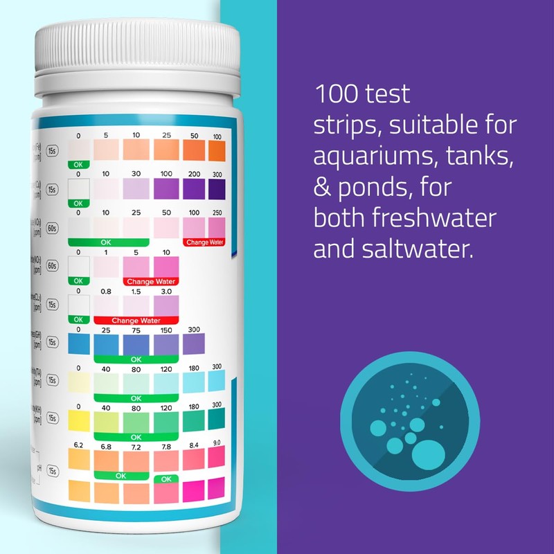 - 100 test strips, monitor your aquarium's water quality confidently. Suitable for both freshwater and saltwater tanks. These versatile strips ensure thorough testing, essential for any aquarium enthusiast.