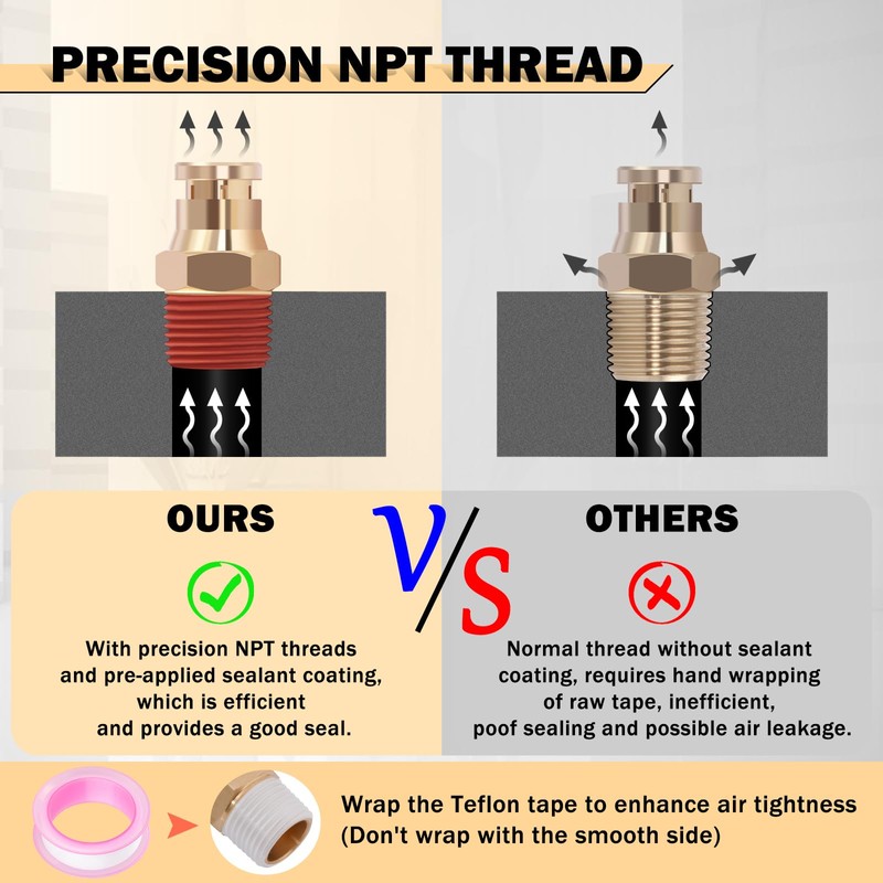 - EASY INSTALLATION: The quick connect design and precise NPT threading make installation of air brake accessories easy, just push to connect. And there is pre-applied sealant on NPT male thread for better sealing
