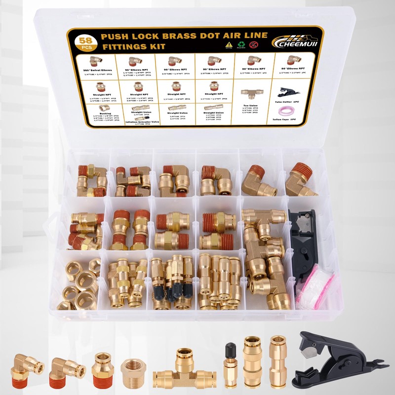 - 58 PCS PACKAGE: The 58 pcs DOT air line fittings assortment includes: 6 pcs brass tube tee fittings, 12 pcs brass straight union connectors, 16 pcs brass straight push & NPT thread, 10 pcs 90°elbows NPT thread, 2 pcs 360° swivel elbows NPT thread, 6 pcs brass bushings, 4 pcs brass 1/4" inflation Schrader valve, 1 pc tube cutter, 1 pc Teflon tape. Air brake line fittings types: 1/8", 1/4", 3/8", 1/2"