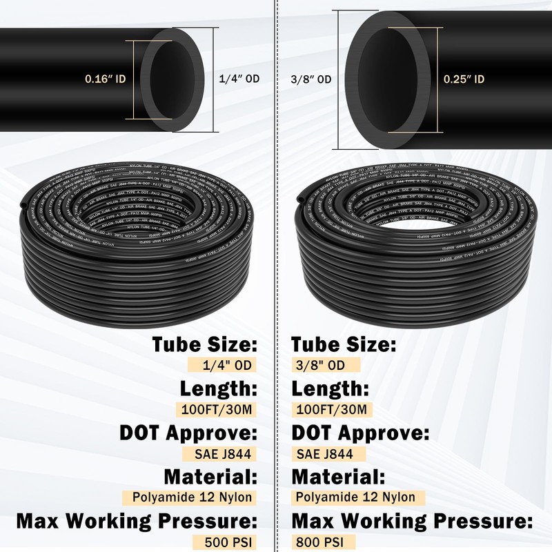 - PREMIUM PA12 DOT AIR HOSE: CheeMuii DOT air lines are made of high-quality Polyamide 12 nylon, meet D.O.T. FMVSS 571.106 approved, SAE J844 air brake system requirements, with corrosion resistance, high-temperature ductility, high pressure resistance and long service life