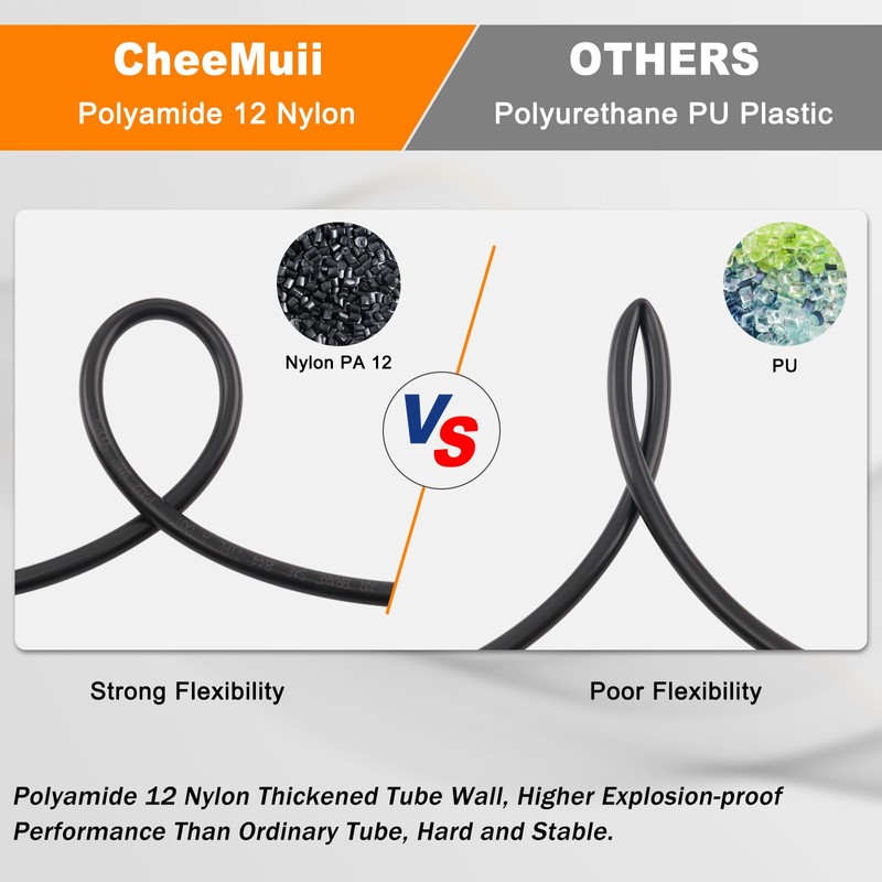 - HIGH-STRENGTH AIR HOSE: CheeMuii reinforced pneumatic tubing has high impact and wear resistance, can withstand higher working pressure, and has a longer service life. At the same time, it has a certain degree of flexibility and can be easily bent to a certain extent without affecting normal use