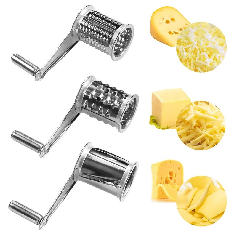 - 3 different rotating stainless steel drums for all types that you can swap out to grate your ingredients either or coarser.