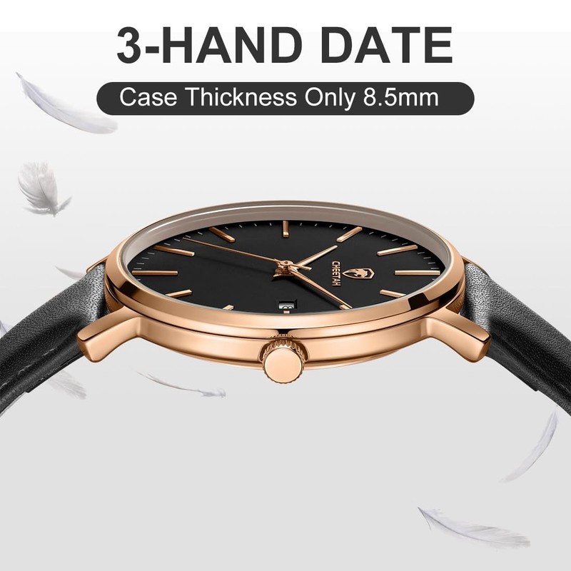 CHEETAH Minimalist Waterproof Quartz Watches for Men Rose Gold Case with Black Leather Strap, Auto Date
