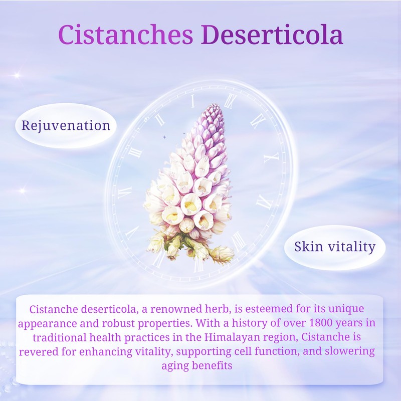 • Tibetan Natural Cistanches Deserticola Extract: Featuring Tibetan natural Cistanches Deserticola extract, known for its ability to inhibit melanin production and even out skin tone. Helps improve the appearance of dark spots and hyperpigmentation, promoting a more uniform and glowing complexion