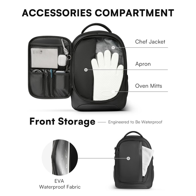 - All-in-One Storage for Everyday Use: The front pocket is lined with waterproof material—perfect for separating aprons or towels to keep the inside clean and organized. An accessory compartment features pen holders, a key clip, and a mesh pocket—great for notebooks, chef coats. Dedicated sleeves hold your tablet or 15.6'' laptop, making it easy to study recipes or take notes wherever you go. A hidden anti-theft pocket on the back keeps your phone and valuables safe while you're on the move