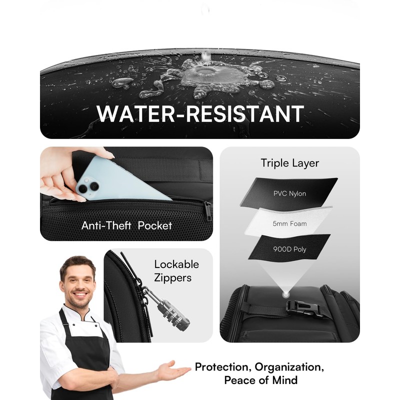 This 4-layer chef knife backpack combines smart organization with durable protection. With 30+ pockets, waterproof compartments, and removable knife panels, it keeps your tools safe and tidy. Made with water-resistant nylon PVC, 5mm foam padding, and tear-resistant 900D lining. Features padded straps, a hidden anti-theft pocket, and a laptop/tablet sleeve for easy carrying. Perfect for culinary students, private chefs, and pros on the go.