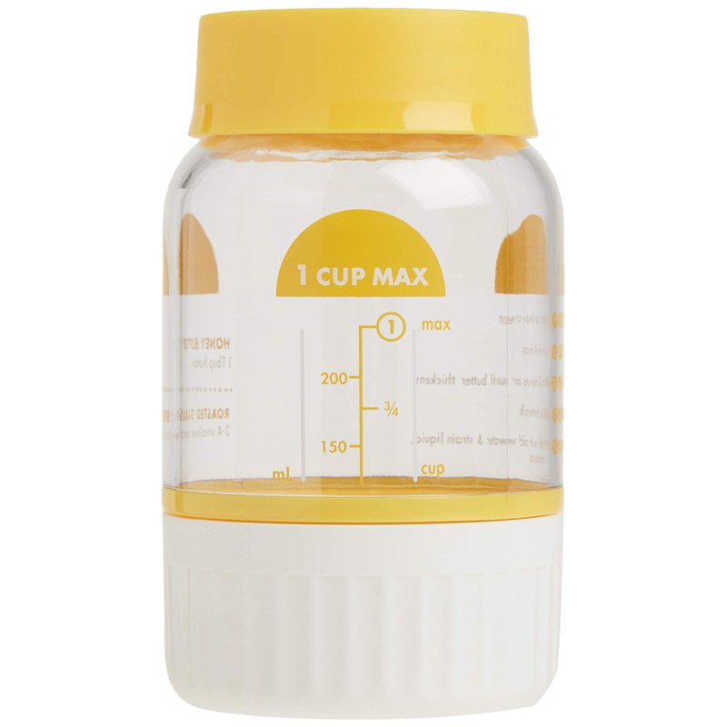 Discover your inner pioneer with the Chef'n Buttercup Butter Maker. Everyone loves the charm of hand churned butter. Now you can make delicious homemade butter in minutes with this innovative mini churn. Simply fill jar with heavy whipping cream that has been stored at room temperature for six to eight hours and shake for three minutes (or until buttermilk separates from butter.) Strain off the buttermilk with the built-in sieve, rinse the butter two to three times with cold water, twist off the ramekin, salt to taste, and enjoy the finished product. Use the included recipes for honey and garlic butter printed right on the side, or mix in fresh herbs to create your own favorites. The bright yellow accents bring homemade charm to your kitchen. Your homemade butter will keep in the refrigerator for 5 to 7 days. This item is top-rack dishwasher safe. Choose smart, easy-to-use kitchen utensils that are built on tasteful design, new technologies, and the trusted reputation of Chef'n.