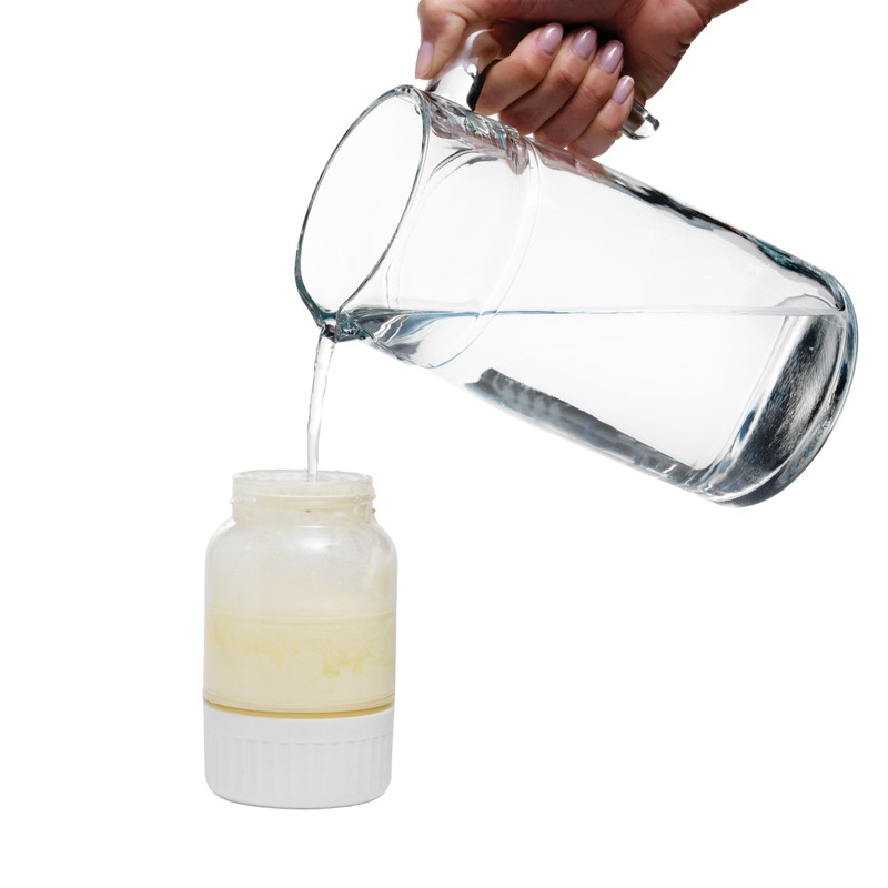 - SIMPLE TO USE: Fill jar with heavy whipping cream that has been stored at room temperature for six to eight hours and shake for three minutes (or until buttermilk separates from butter). Strain off the buttermilk with the built-in sieve, rinse the butter two to three times with cold water, twist off the ramekin, add salt to taste, and enjoy the tasty, homemade butter.