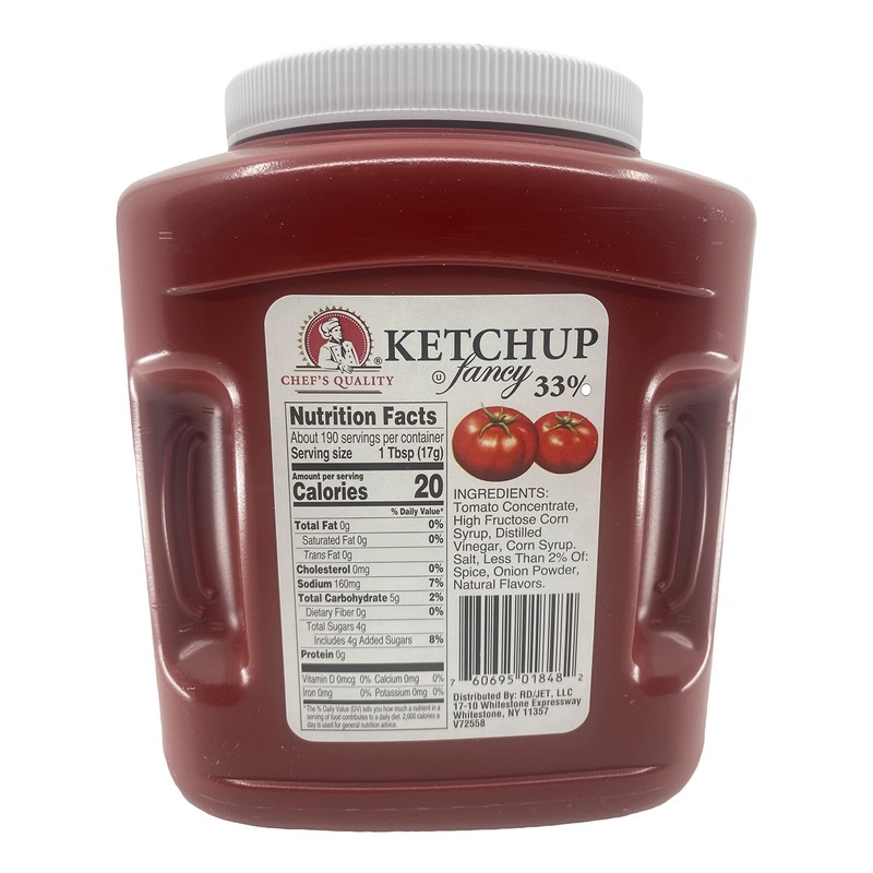Made from fresh-ripened tomatoes and a special blend of spices, onion powder, and vinegar, this Chef's Quality fancy grade tomato ketchup adds the perfect sweet and slightly tangy flavor to your menu items. Its vibrant red color and sweet, smooth consistency, and juicy taste make it a classic option to dip and enjoy with mild fried foods or to spread on top of sandwiches. From crispy, golden-brown french fries to hearty, old-fashioned burgers, your guests will fall head over heels for this savory condiment. Chef's Quality ketchup is created from premium tomatoes, grown from a special seed that produces rich tomatoes packed full of nutrients. This fancy grade ketchup is also the USDA's highest grade for ketchup, as it has the highest tomato solid concentration in comparison to other grades. Chef's Quality ketchup includes essential vitamins, minerals, and lycopene, a healthy antioxidant found in cooked tomatoes. The jug is also easy to store as it's designed to easily close for safe storing, eliminating the need to waste time moving product into a different container for storage. Keep this ketchup on hand to make baked beans, marinades, and chili sauce or simply serve it plain to give your customers the condiment they grew up with and still love.