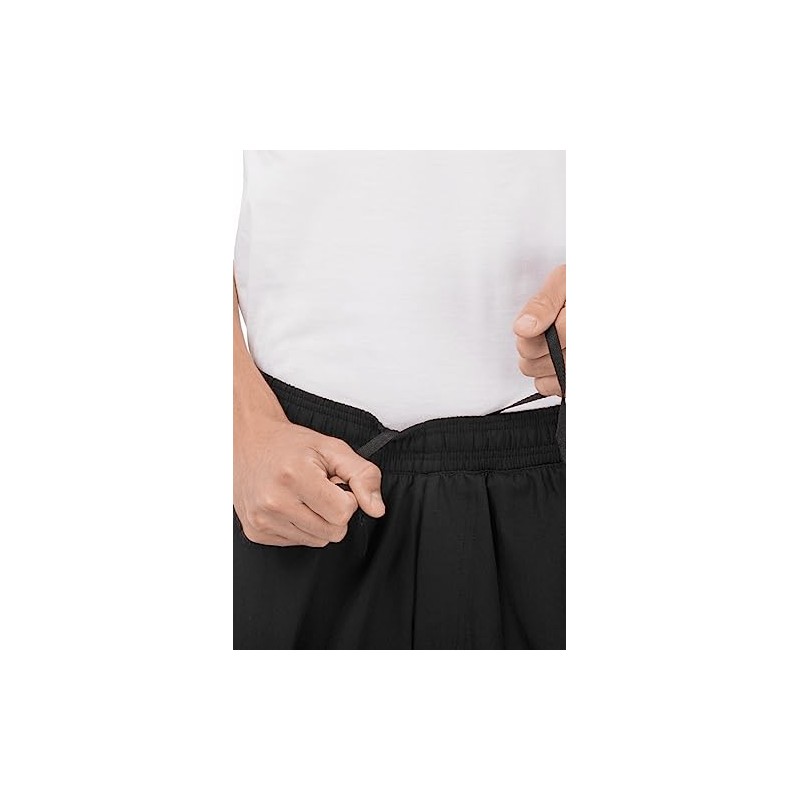 - Elastic waistband with built-in flat drawstring and zipper fly