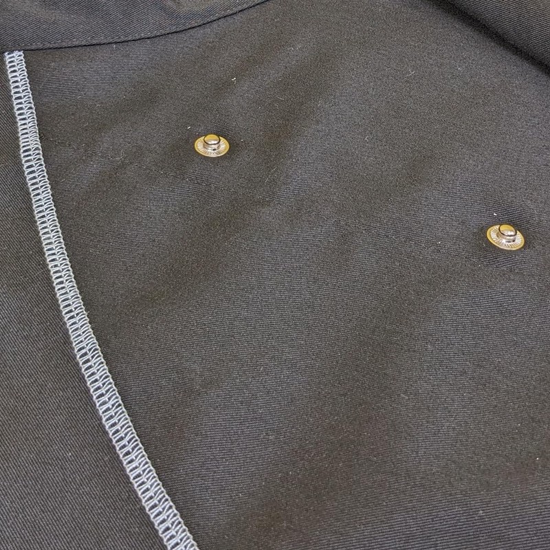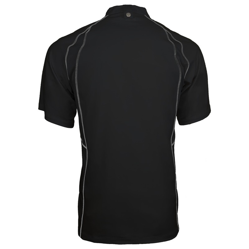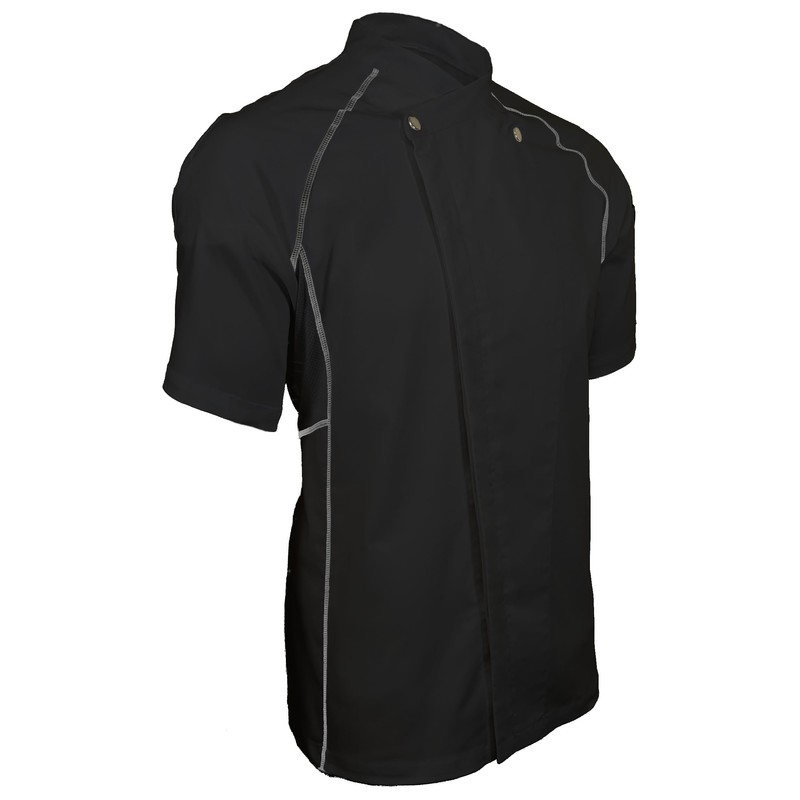 • This sleek black chef coat features a stand-up collar, mesh under-arm panels, and a back-collar apron holder, combining functionality with contemporary style.