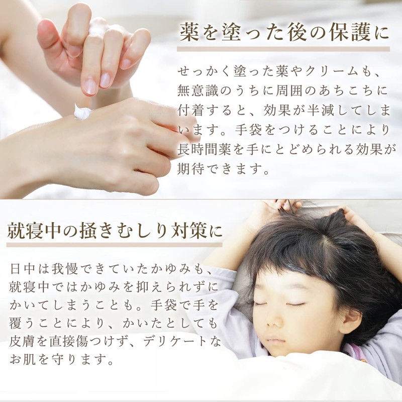 - 夜の掻きむしりに対するバリア機能を高めよう。肌を傷つけず保護するナイトグローブ 夜のかきむしり対策に頼もしい手袋。肌を傷つけずにかきむしりを防止することで、肌本来が持つバリア機能を取り戻しましょう。優れた肌触りとフィット感で、快適に装着できることも特長です。また、綿素材ならではの通気性と吸湿性により、快適な睡眠環境を提供します。アトピーなどの夜間のかきむしりにお悩みの方に、心地よいサポートをお届けします。また、爪噛みや、ゆびしゃぶりでお悩みのご家庭に、お子様の爪かみ防止、指しゃぶりなどの指先カバーとして。