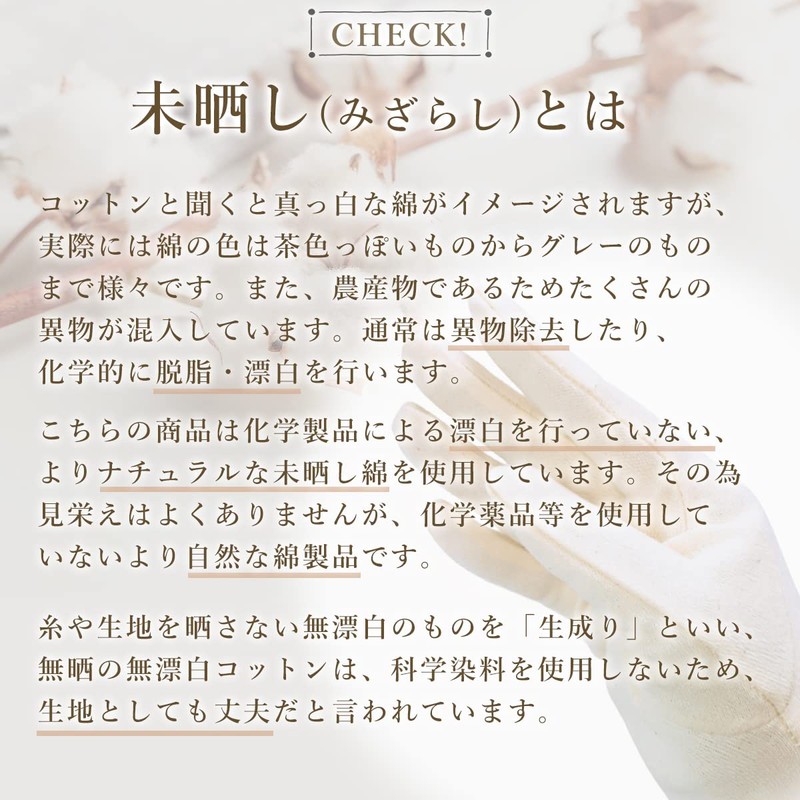 - 無漂白のみざらし綿を贅沢に使用。自然派志向の方にこだわりの素材、未晒し綿でつくられた手袋。 自然な風合いとやさしさを追求した未晒し手袋です。漂白を行っていない未晒し綿を贅沢に使用。肌に触れる部分には、特にこだわりました。無漂白の綿100%ならではの自然な風合いと柔らかさが、手肌を包み込みます。心地よい肌触りと自然なカラーリングが、あなたのファッションスタイルに調和し、個性を引き立てます。自然素材へのこだわりをお持ちの方におすすめです。