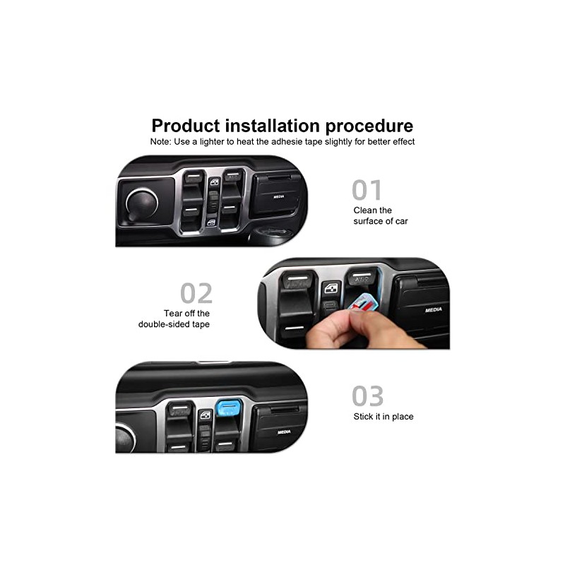 CheroCar Window Switch Button Cover Trim Interior AccessorieOur CheroCar Company IdeasAlways adhere to the customer first, quality first, service first.Production Control- All products are produced after repeated proofing, test and small batch production, in order to let the products received by all customers are the most perfect and most suitable.- CheroCar all products have the QC in each process for inspection, the quality can be guaranteed accordingly.Installation Notes- Window Switch Button Cover Trim Interior install with double-sided tape.- Use a hair dryer to heat the double-sided tape.- With double-sided tape adhesives tape on the back, Cleaning surface and heat the double-sided tape by a hair dryer before stick on, then press it almost 1 minute- If you need to remove the cover, blow the edge of the cover with a hair dryer, remove the cover after heating, and spray with glue remover to remove the glue marksAbout Our Window Switch Button Cover TrimInterior Accessories- Our product perfect for Jeep Wrangler JL JLU Gladiator JT 2018-2021- Made of durable and long lasting material.Durable and color will not fade out- Decorate your car charming luxury vivid, help DIY a style and atitute for your JL- Well constructed, made up of a solid piece of material with just the right amount of flexibility to it- Easy to install,- Cover existing scratches and prevents your car from future finger nails, keys scratches etc.Worry-Free to buy- We believe in our products. That's why we back them all with an 12-month warranty and provide friendly, easy-to-reach support.- If you have any suggestions for improvement of our products, please be sure to email us at the first time, we will make corresponding improvements in time.What's in the Box4 pieces CheroCar Window Switch Button Cover Trim Interior replac