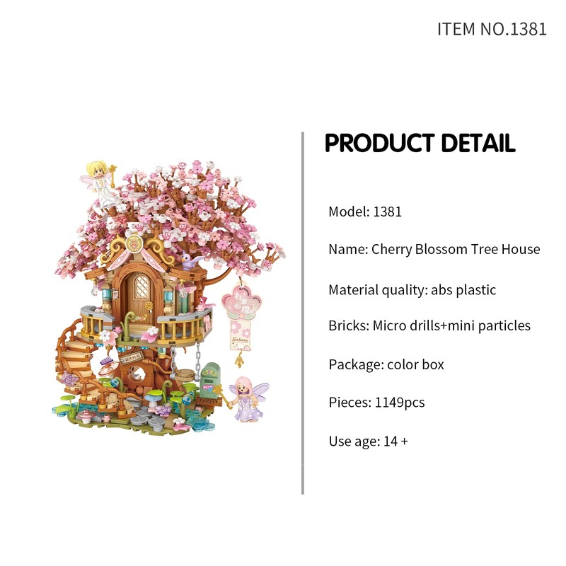 - 1149PCS Sakura-Themed Mini Block Set – Featuring delicate cherry blossom petals, fairy characters, and detailed accessories, this cherry blossom tree house kit is perfect for collectors and miniature scene lovers. Popular among fans of sakura toys, mini block houses, and fairy garden building sets.