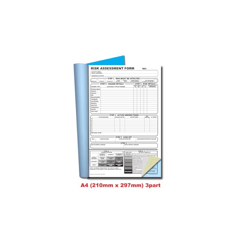 - Triplicate Risk Assessment book for any employer that needs to identify any hazards in the workplace.