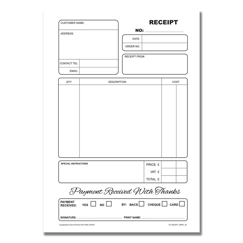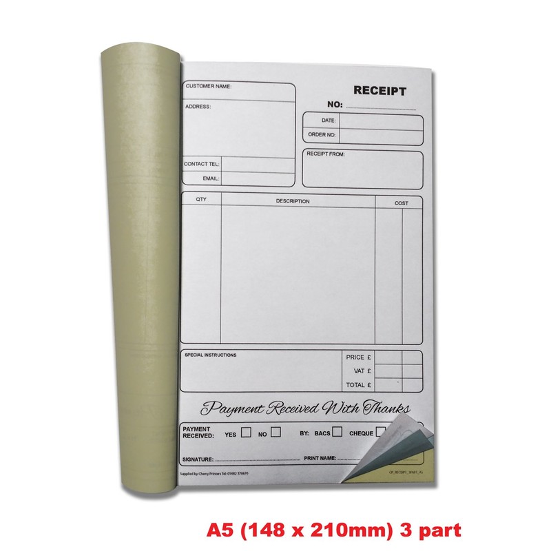 - Cash receipt triplicate book for issuing a detailed receipt to customers, whilst keeping a duplicate copy on the book. With the added information of how the payment has been made for convenience.