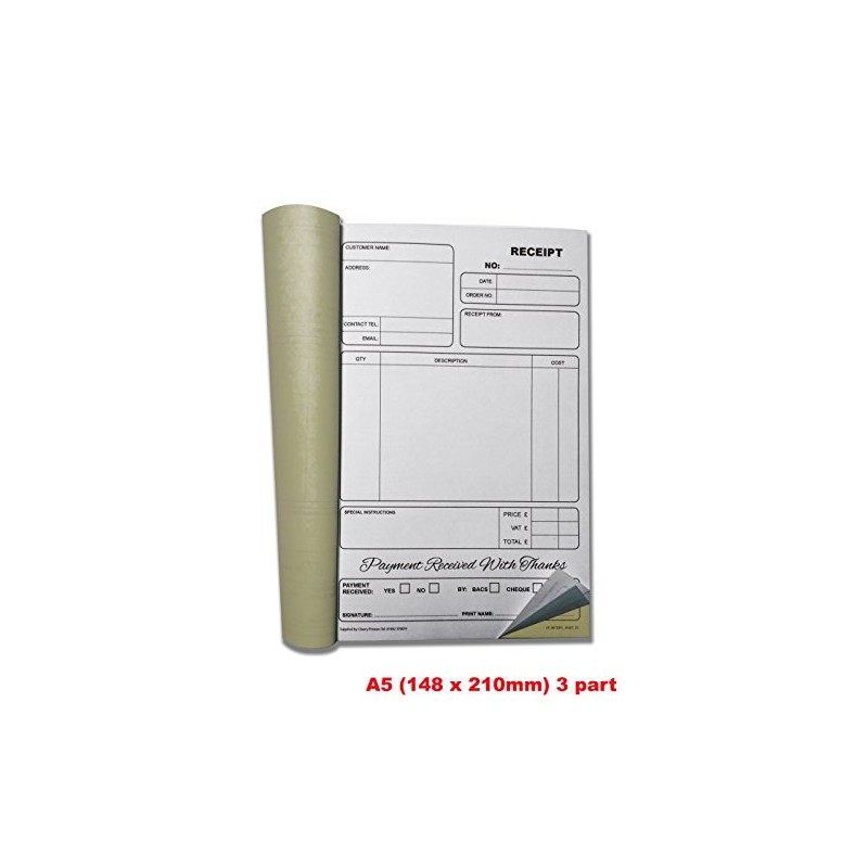 - Top & middle copy perforated for easy removal on left hand edge whilst bottom copy remains in the book. Stitched and bound with tape for a traditional finish.