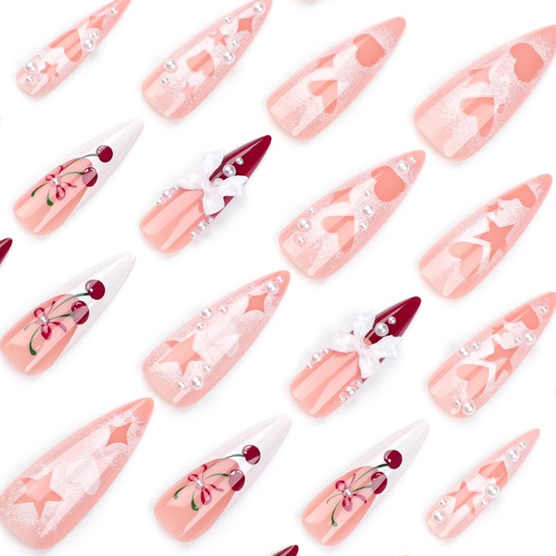 - Perfect for Any Occasion: Our stiletto fake nails have red French tips, 3D bow cherry designs and glossy acrylic finish. These 24PCS extra long full cover stick on nails make a great gift, and are the perfect accessory for parties, date nights, holidays and daily cute glamour