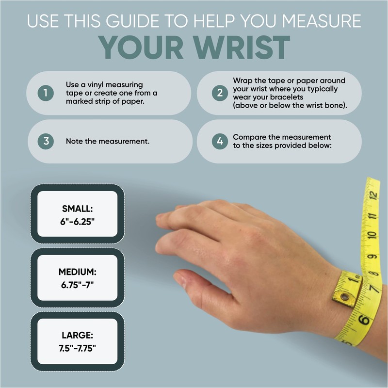 - UNISEX: Three sizes available: Small (6”-6.25”), Medium (6.75”-7”), and Large (7.5”-7.75”). Please measure your wrist at the point you like to wear your bracelets. If between sizes, size up or down depending on if you like your bracelets a little tight or loose. Please see the description below for an easy way to measure your wrist.