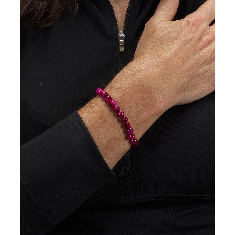 - CONTAINS: A pink tiger’s eye bracelet made with 6mm semi-precious beads packaged inside a protective cloth drawstring pouch. Tiger’s eye is member if the quartz family. It has chatoyancy, a property which gives it the appearance of having light coming from within the stone. This is the pink dyed variety.