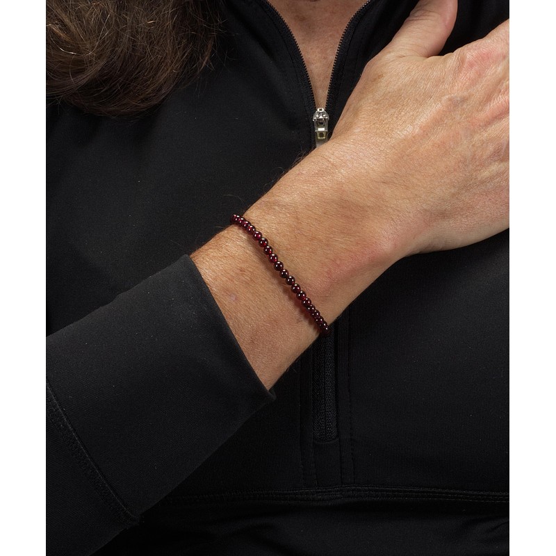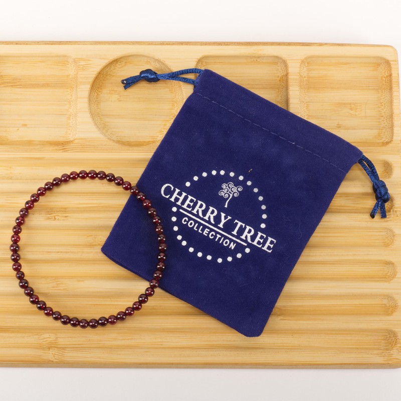 - CONTAINS: A red garnet bracelet made with 4mm semi-precious beads packaged inside a protective cloth drawstring pouch. Red garnet is pyrope, a red variety. Garnets have been used as gemstones since the bronze age.