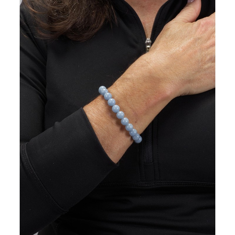- CONTAINS: An angelite bracelet made with 8mm semi-precious beads packaged inside a protective cloth drawstring pouch. Angelite, also known as blue anhydrite, is a soft light blue gemstone discovered recently in Lima, Peru.