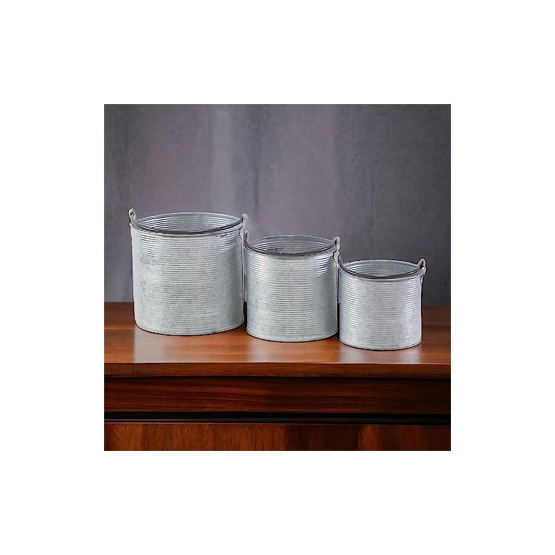- A set of 3 (large, medium, small) round, galvanized buckets with decor accents