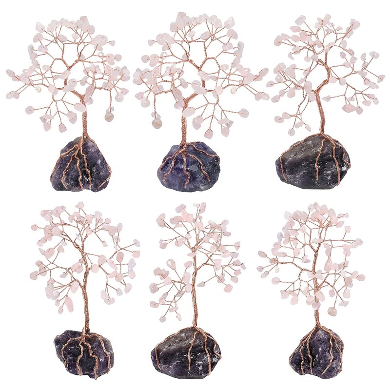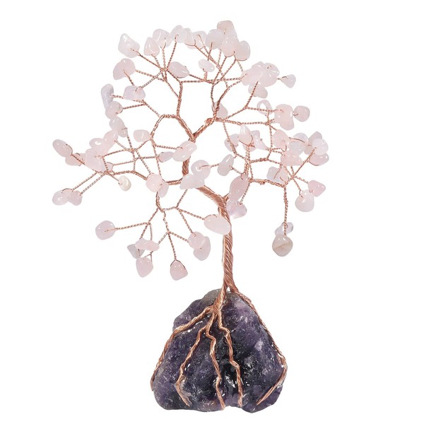 Cheungshing 6-7” Natural Healing Crystal Bonsai Tree with Irregularity Amethyst Raw Stone Table Desk Home Decoration, Rose Quartz