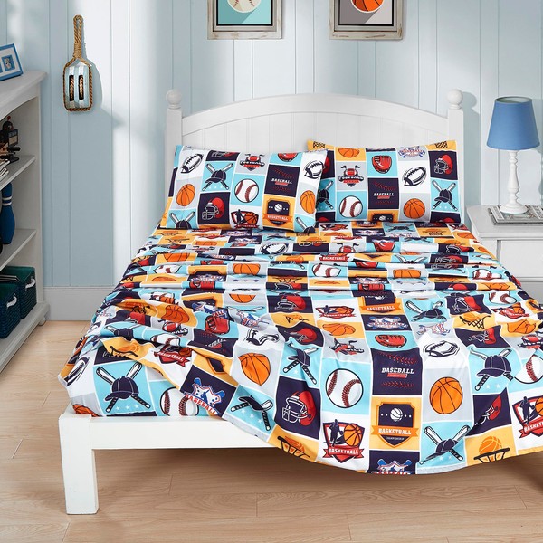 - Perfect way to transform your kids bedroom with this sporty sheet set in a bright, fun, and cheery design. Various sports patterns including basketball, baseball, football, and soccer. Express the joy of your kids love for sports in their rooms. Made of a lightweight microfiber polyester fabric for a softer touch. A great gift for birthdays, Christmas, and any other occasions!
