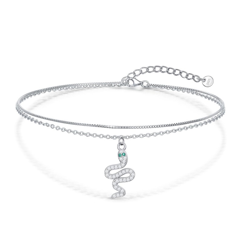 CHIC & ARTSY 925 Sterling Silver Snake Double Layer Anklet for Women - Adjustable Lightweight Hypoallergenic Ankle Bracelet with Boho Chic Design for Daily & Beach Wear