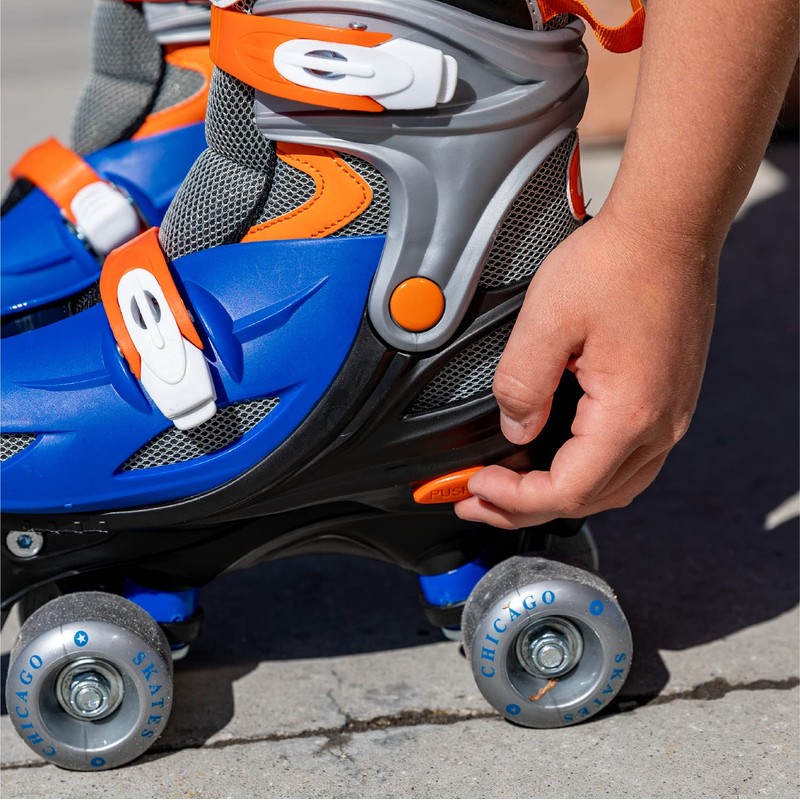 - ADJUSTABLE QUAD SKATES: The classic, popular, most recognizable skate on the market! The Chicago Skates Adjustable Junior Quad Skates adjust four full shoe sizes with the push of a button.