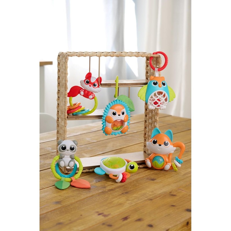 - Rattle ball inside the fox and textured slide rings on the fox's tail