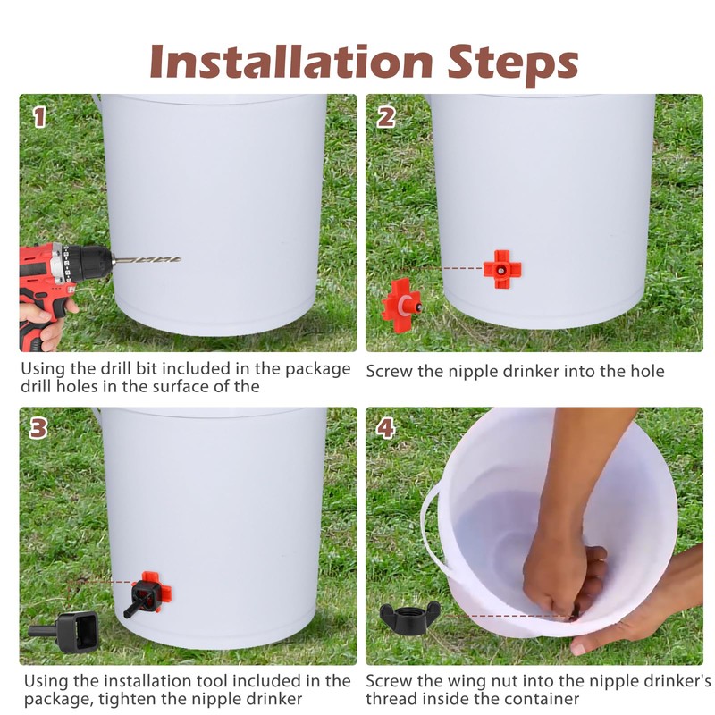 Chicken Water Nipples, 15 Pcs Horizontal Poultry Automatic Waterer Nipples for Bucket with 15 Pcs Ring Gaskets, 15 Pcs Wing Nuts, 9mm Drill Bit and an Installation Tool Ullnosoo