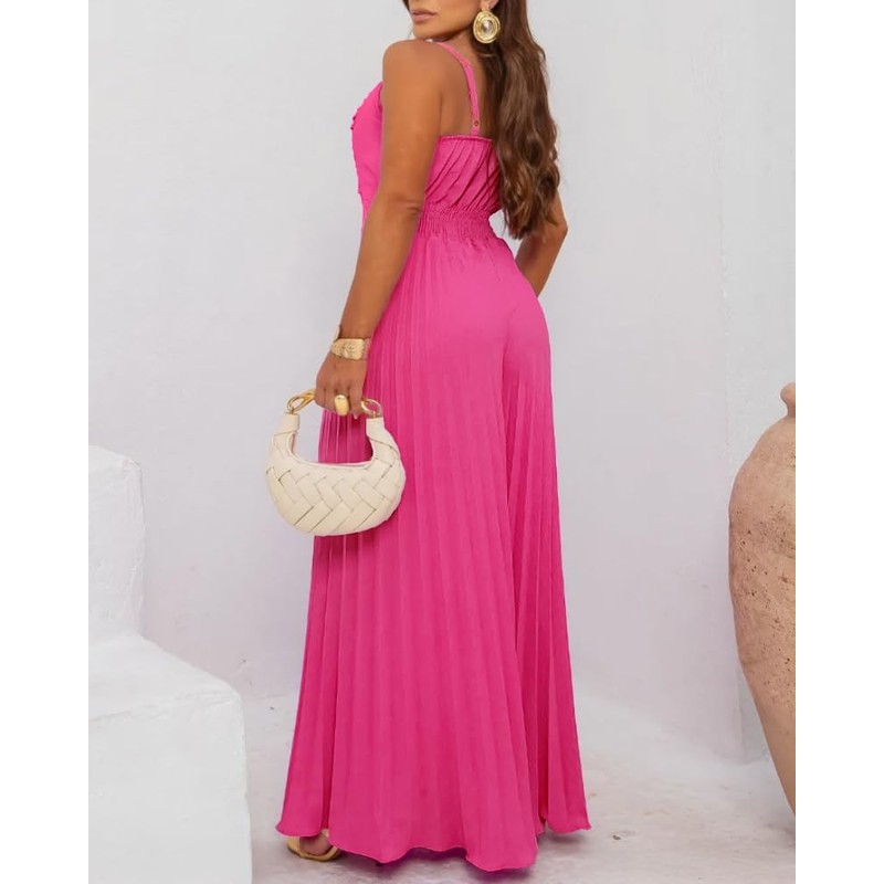 CHICME Jumpsuit for Women Summer Dressy Pleated V Neck Spaghetti Strap Jumpsuit Casual Waist Wide Leg Hot Pink Overalls-S