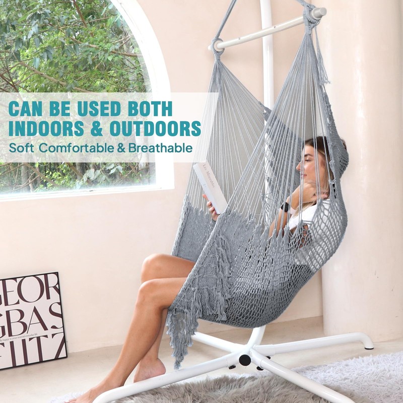 - Stylish & Versatility: Hammock chairs can be used both indoors and outdoors, making them a versatile piece of furniture. They are great for use in a variety of settings, from the living room to the porch to the garden. Hammock chairs are available in a range of colors, making them a stylish addition to any home. They can add a touch of bohemian or coastal charm to any space.