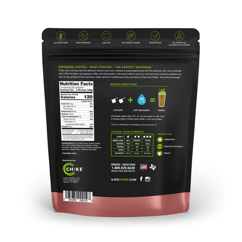 No artificial colors or flavors. 20 g whey protein. 1 g sugar. Gluten free. Low fat. High protein. Vegetarian. No added sugars. 2 espresso shots. Espresso coffee + whey protein = the perfect beverage. Power your morning, beat that afternoon slump or give your workouts a supercharged boost with this delicious, all-in-one nut rich flavor, real espresso coffee, and whey protein, Chike lced Coffee is what your mind and body craves to energy your goodbye to the expensive, empty calories of coffeehouse drinks and hello to Chike lced Coffee - the perfect beverage! Perfect for: Breakfast. Pre/post-workout. Snack. Ilikechike.com. Facebook. Instagram. Orders / Questions: 1.800.929.9439 Monday-Friday, 9 AM - 5 PM CST. Made in U.S.A. Made in Texas.