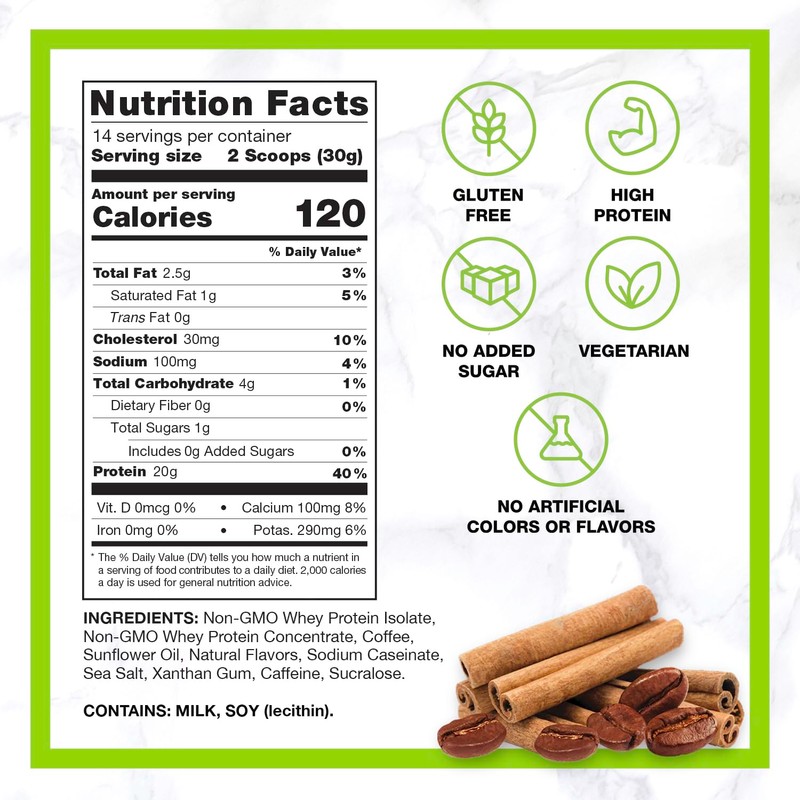 - COFFEE PLUS PROTEIN - Each serving contains 2 shots of real espresso coffee and 20 grams of non-GMO whey protein.