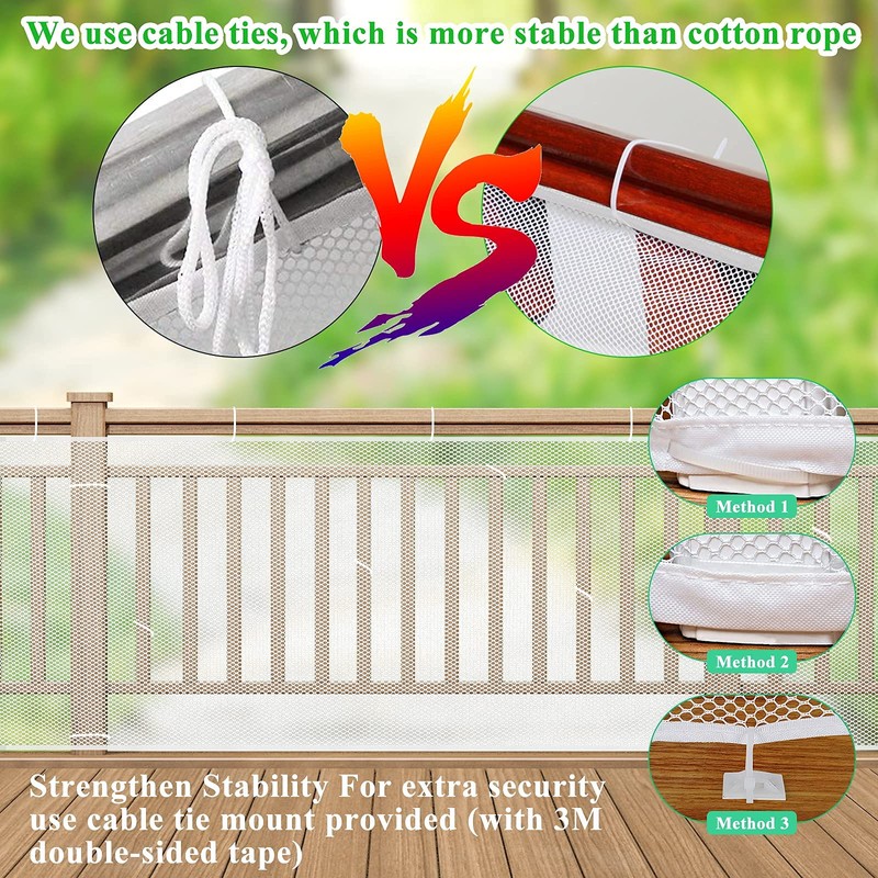 According to buyers suggestions, our company has already upgraded indoor/outdoor banister mesh net guard regarding longer length; taller height, double stitching edge, more enclosed zip ties, and extra accessories help attach net, make the net motionless, etc.