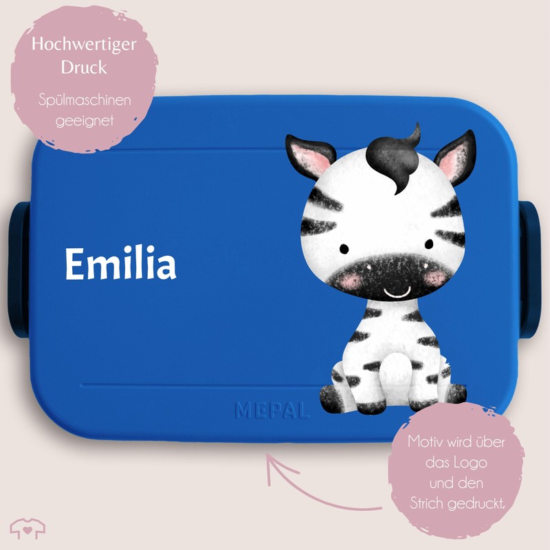 - Zebra design: the zebra theme is becoming increasingly popular and you are looking for matching lunch boxes. Have you inquired about "lunch box for children"? This golden motif is the perfect gift and is guaranteed to make zebra fans and children shine. The cute graphic is a real eye-catcher for any occasion
