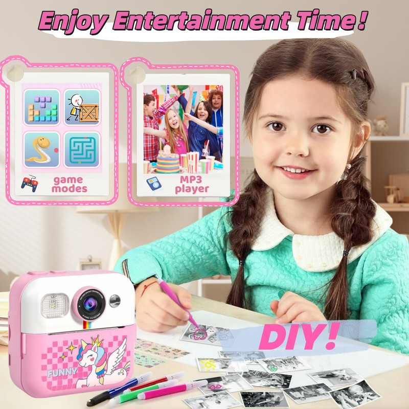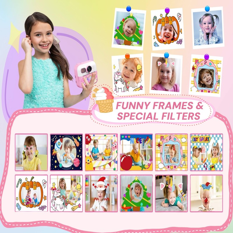 Diese Kinder Sofortbildkamera ist vollgepackt mit Spaß: Videos aufnehmen, Musik abspielen, Spiele entdecken und Fotos mit kreativen Filtern und Rahmen verbessern.