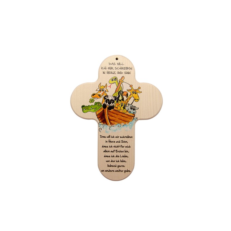 This beautiful children's cross is printed with a colourful, child-friendly motif of the Noah's Ark and a touching blessing. Thanks to the enchanting look, the cross creates a peaceful, harmonious mood and finds its place in any child's room, whether as a decorative piece or patron against the wall over the cot
