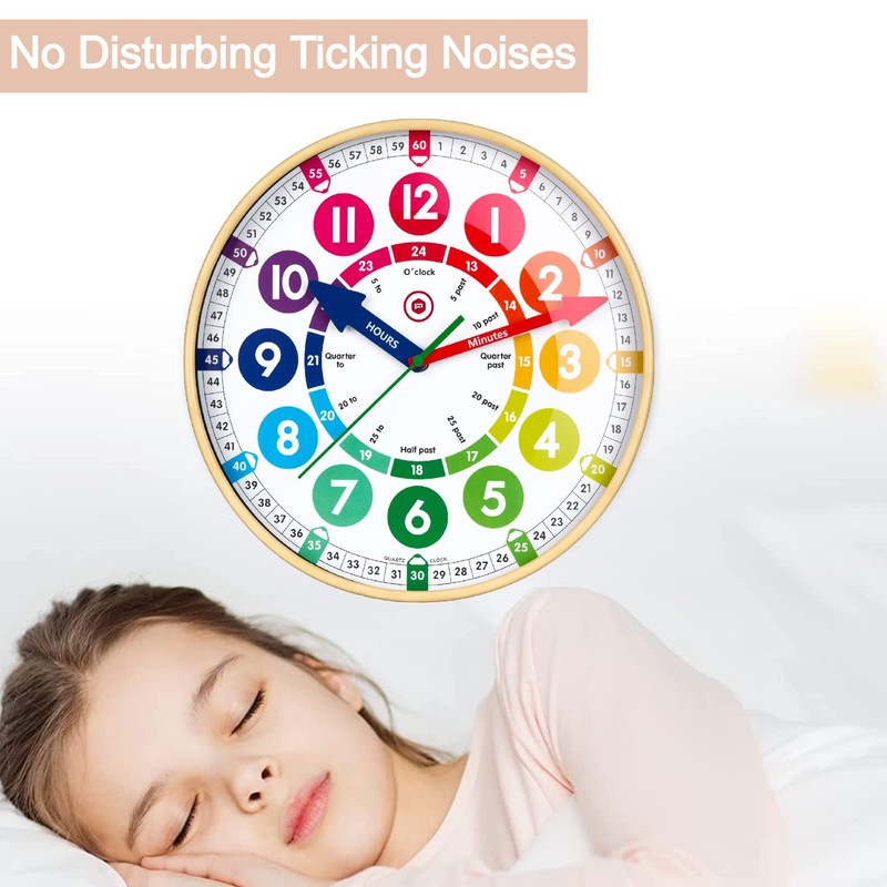 - Attractive Design: In addition to excellent quality, this learning wall clock provides your child with a super fun and interesting design. Every number of the hour and minute, the interval of 5 minutes and the quarter is represented by a different bright colour, the coloured minute and hour hands are clearly marked to make learning fun for your child .