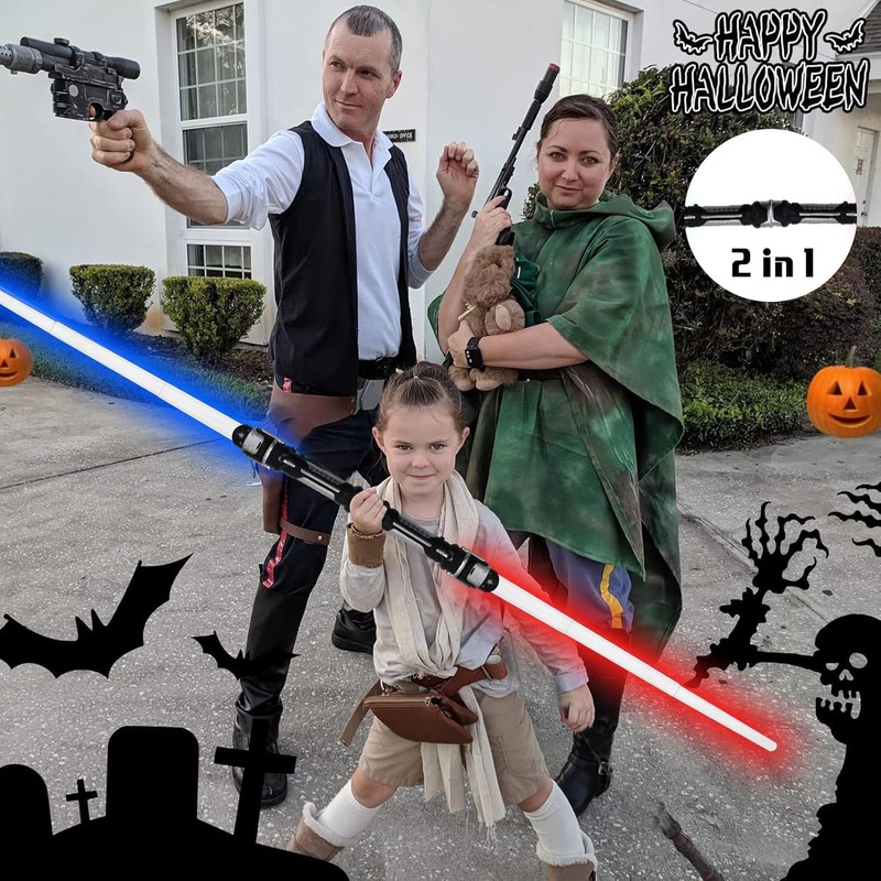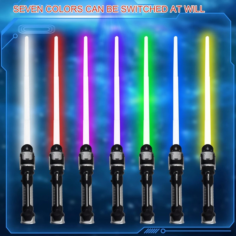 - LED light saber: you will receive 2 lightsabers, 2 in 1 lightsaber for children, you can sew the two swords together, RGB lightsaber can output 7 different colours (with sound, can be switched off), retractable, the total length of the opening is 65 cm, which is easy to store and has a strong sense of use.