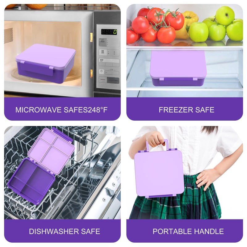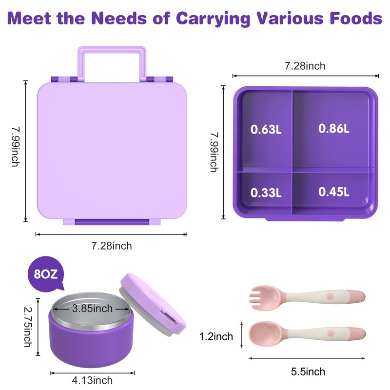 Children's Lunch Box Set with 300 ml Thermal Container for Food, Leak-Proof Lunch Box Children with 4 Compartments, Insulated Lunch Bag, BPA-Free Thermal Lunch Box Children, School, Excursions, Purple