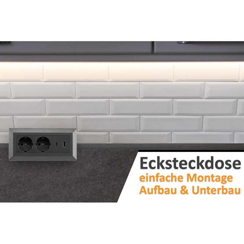 ChiliTec ChiliTec Steckdosenblock Ecksteckdose 2-Fach Schutzkontaktsteckdose USB-A USB-C PD mit 1,5m Kabel Aufbau Unterbau Montage Anthrazit