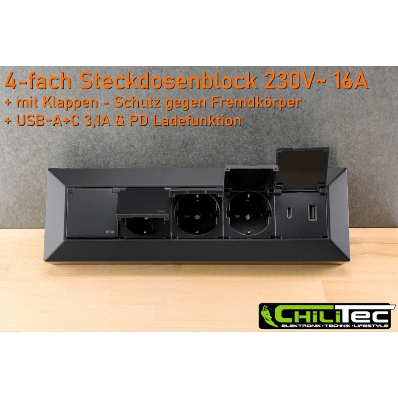 ChiliTec Socket Block 4-Way Multiple Socket with Hinged Lid USB-A USB-C PD 230 V Socket for Kitchen Office Workshop Black